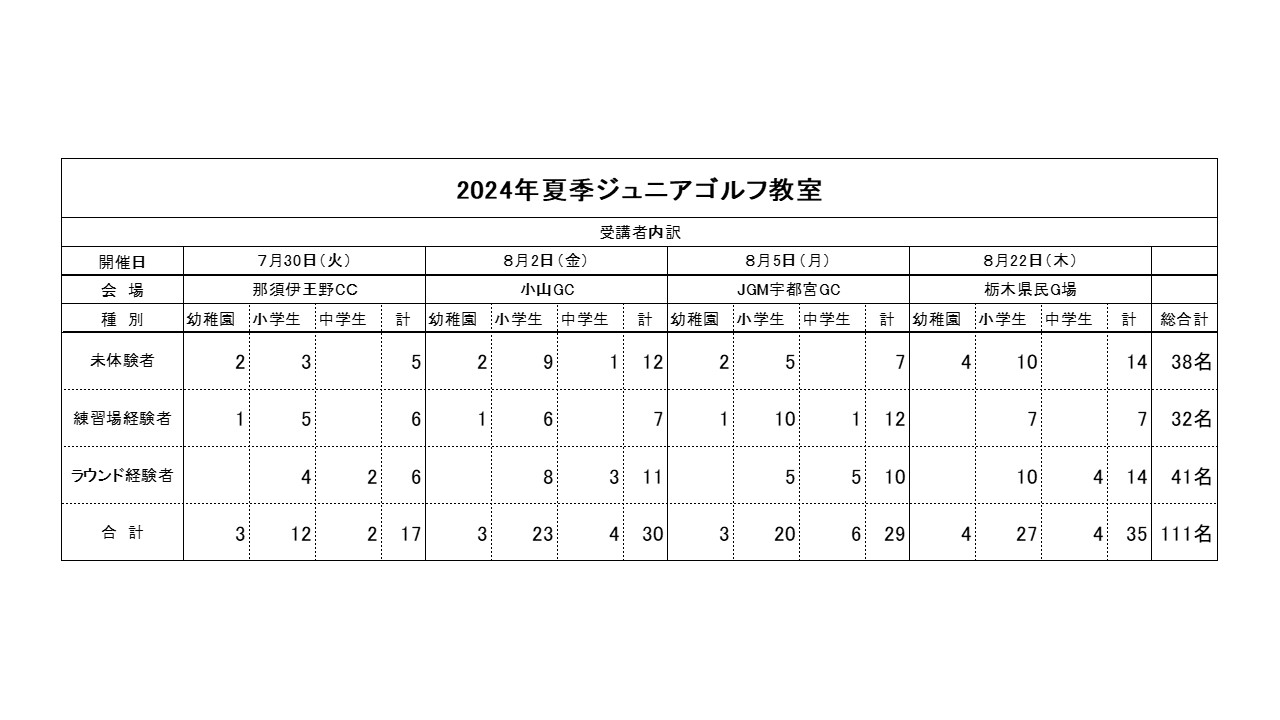 「栃木県ゴルフ場協議会」では平成12年から毎年、子供たちの夏休み期間中に世代を超えて末永く楽しめるゴルフについてゴルフを体験してもらい、この教室をきっかけにゴルフを楽しんでもらうことを目的に開催しております。
