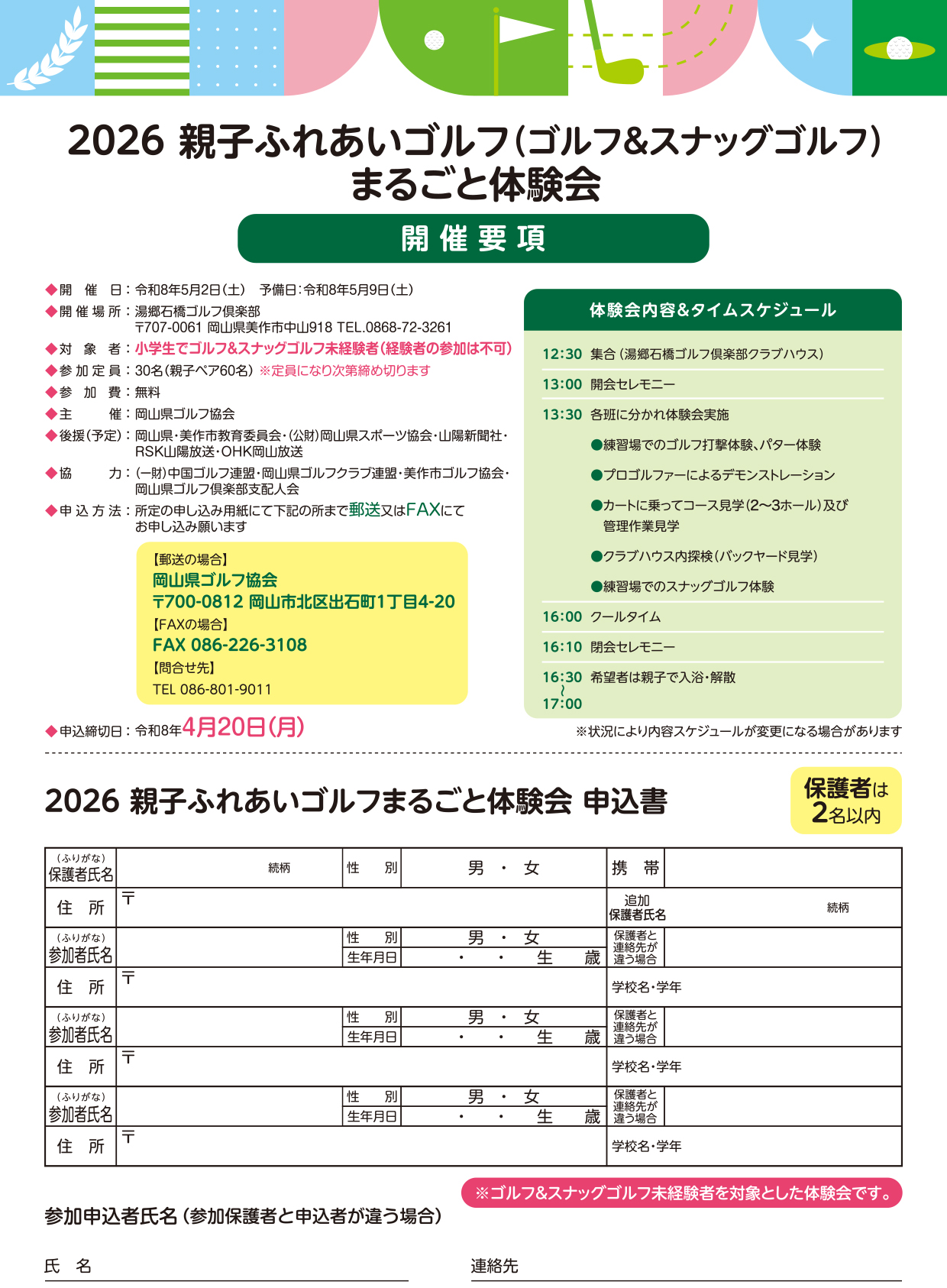 ◆対象者:岡山県内在住の小学生でゴルフ&スナッグゴルフに興味のある方で、今までゴルフやスナッグゴルフを体験した事の無い方