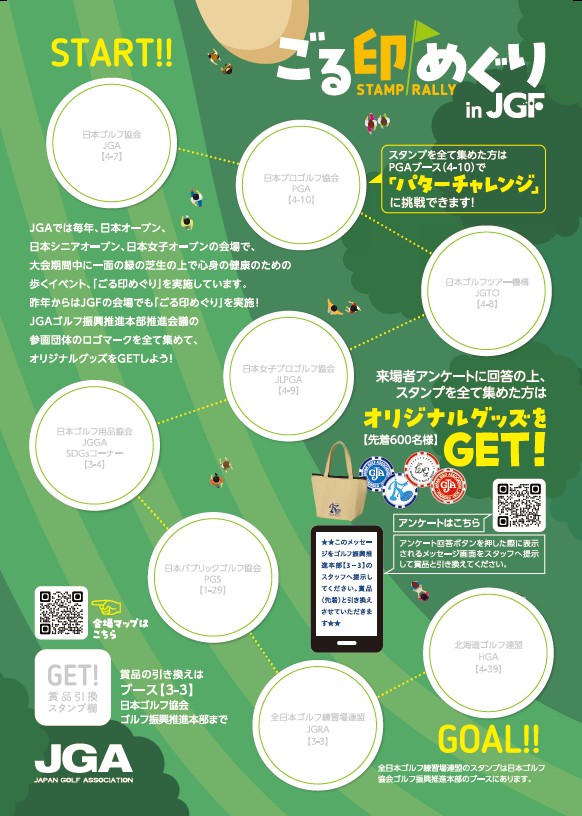 期間中、毎年日本オープン、日本女子オープン、日本シニアオープンの会場で開催している、健康のために歩くイベント「スタンプラリー・ごる印めぐり」を会場でも実施します。